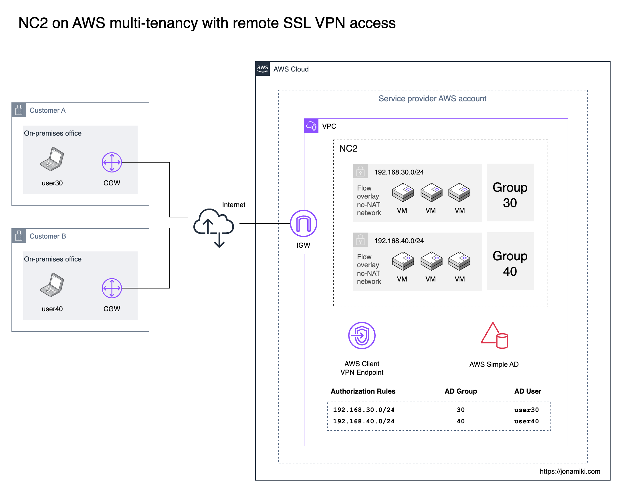 The AWS Client VPN Endpoint service is used to provide secure access to each environment for the end users. Authorization rules within the VPN Endpoint are used to restrict users in each AD user group to their specific NC2 subnet.