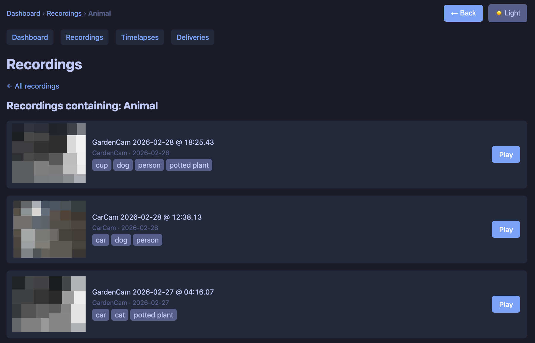 A FastAPI web app serves a dashboard and all the browse/play views. It’s built for same-tab, kiosk-friendly use (e.g. on a wall tablet): live view, recordings, timelapses, and delivery notifications all stay in one window, with breadcrumbs and a back button. There’s a light/dark theme toggle for those of us who like to burn our retinas out with white backgrounds. The layout is responsive so you can use it on a phone or a big screen.