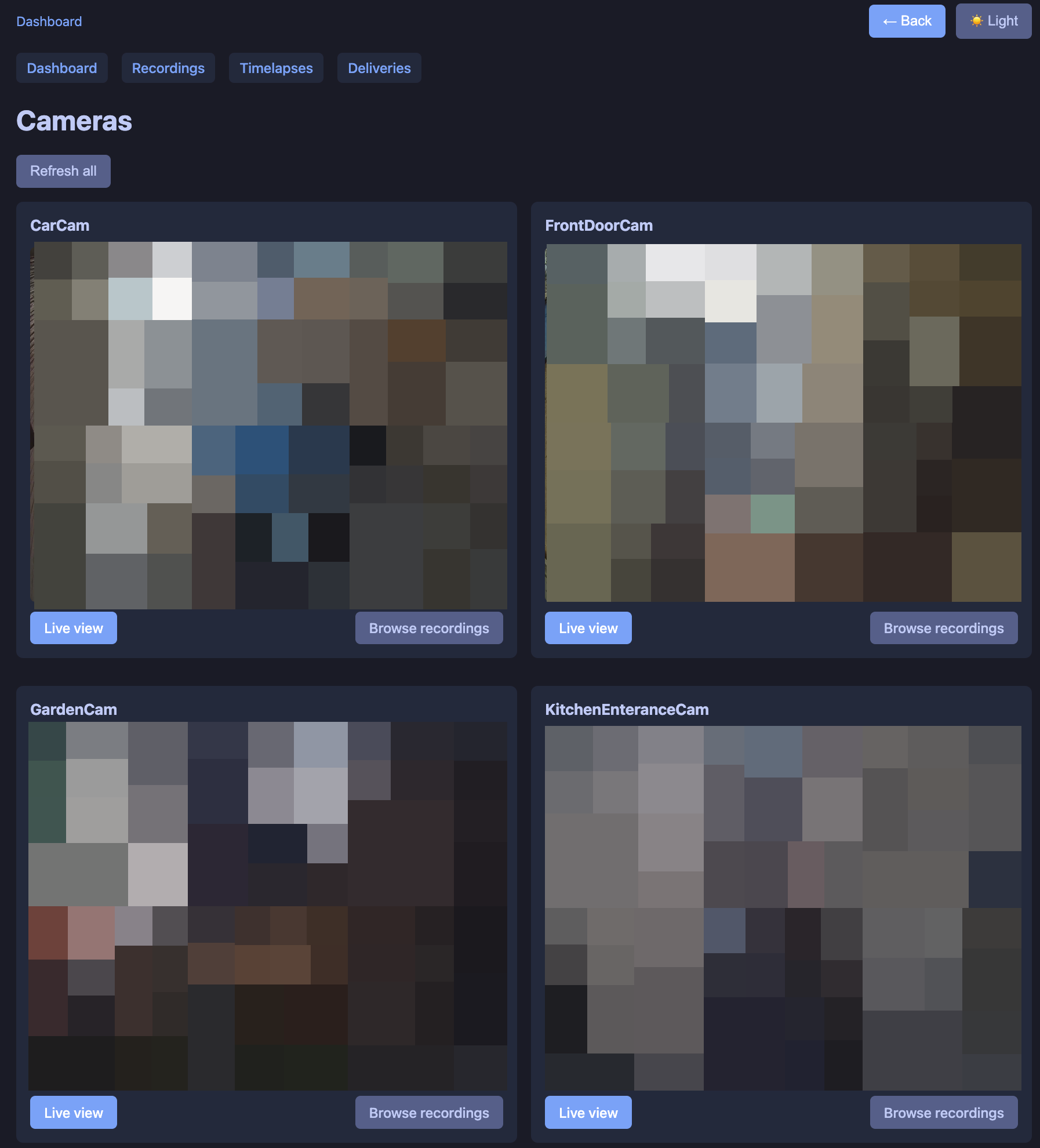 The dashboard is the home screen: a grid of live snapshots (one per camera), each clickable. Clicking a camera opens a live view page that keeps refreshing the snapshot so you get a simple “live” feed. A “Refresh all” button on the dashboard reloads all snapshot images. Navigation at the top: Dashboard, Recordings, Timelapses, Deliveries.