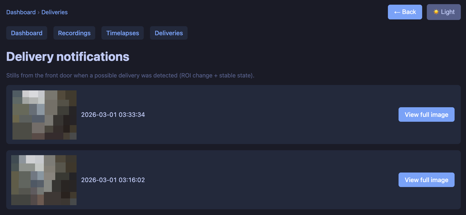 The Deliveries page lists delivery notifications: each time the delivery detector fired, we store a still and show it here. Newest first, with a thumbnail and “View full image.” So even if you miss the ntfy push, you have a log in the UI. Clicking opens the full image in the same tab (breadcrumb, Back).