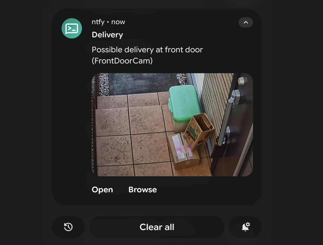 We wanted a push to our phones without a cloud NVR or subscription. ntfy does that with a basic pub-sub system. You subscribe to a topic (e.g. in the ntfy app), and the detector POSTs to that topic when it fires. The message includes a title and body; we also attach an image so you see the step (and the box) in the notification.