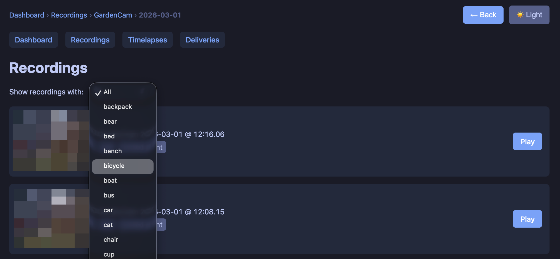 A FastAPI web app serves a dashboard and all the browse/play views. It’s built for same-tab, kiosk-friendly use (e.g. on a wall tablet): live view, recordings, timelapses, and delivery notifications all stay in one window, with breadcrumbs and a back button. There’s a light/dark theme toggle for those of us who like to burn our retinas out with white backgrounds. The layout is responsive so you can use it on a phone or a big screen.